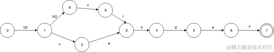 key输出的共享机制同样适用于共同前缀和共同后缀。比如我们有tuesday:3和thursday:5这样的FST: