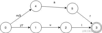 当我们在这个FSA里加入“jun”,那么它和“jul”有共同的前缀“ju” :