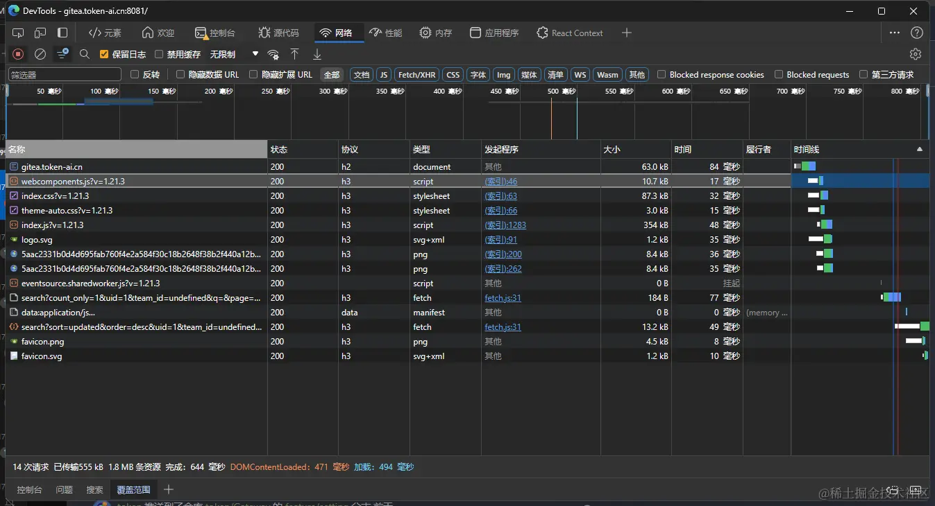 将我们的证书上传以后点击右上角的刷新缓存,则会生效,还需要注意将我们的域名解析到服务器当中。上面我们用的是gitea.token-ai.cn,注意的是自签证书似乎不能使用。上面操作完成以后点击我们右上角的刷新缓存,然后访问我们的https://gitea.token-ai.cn:8081,然后打开浏览器的F12,我们可以看到我们的,我们的协议除了第一个都是h3协议,这是因为第一个请求是不确定你是否支持h3所以发起一个h1或h2的协议然后,如果你的响应头响应了Alt-Svc则会下次请求使用h3,