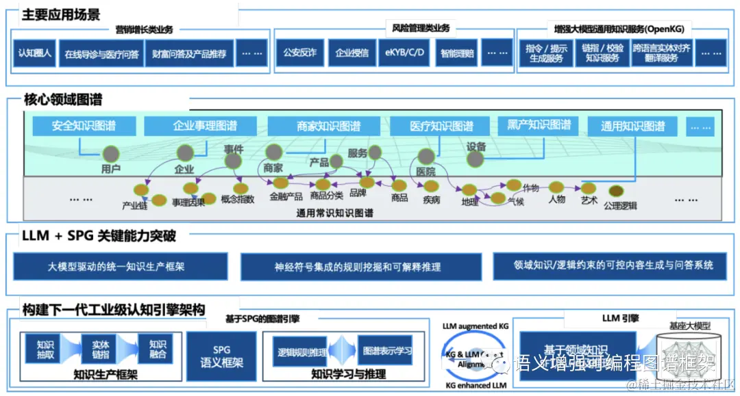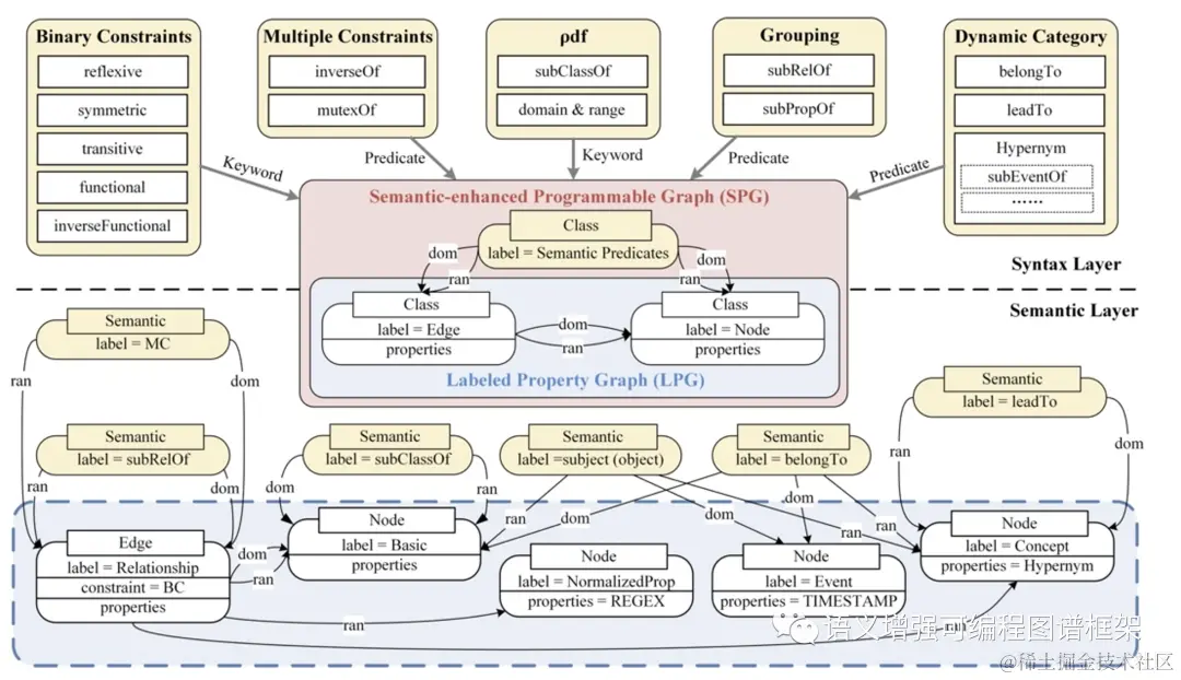 然而,任何复杂技术的大规模产业化应用都需要统一的技术框架,以屏蔽复杂的技术细节以实现跨场景迁移性支持新业务的快速部署。蚂蚁知识图谱团队通过多年业务实践的总结,提出了新一代知识语义框架SPG,充分借力LPG的结构性与RDF的语义性实现可编程范式的知识引擎架构,支持各领域图谱的高效构建和跨领域的知识语义对齐。