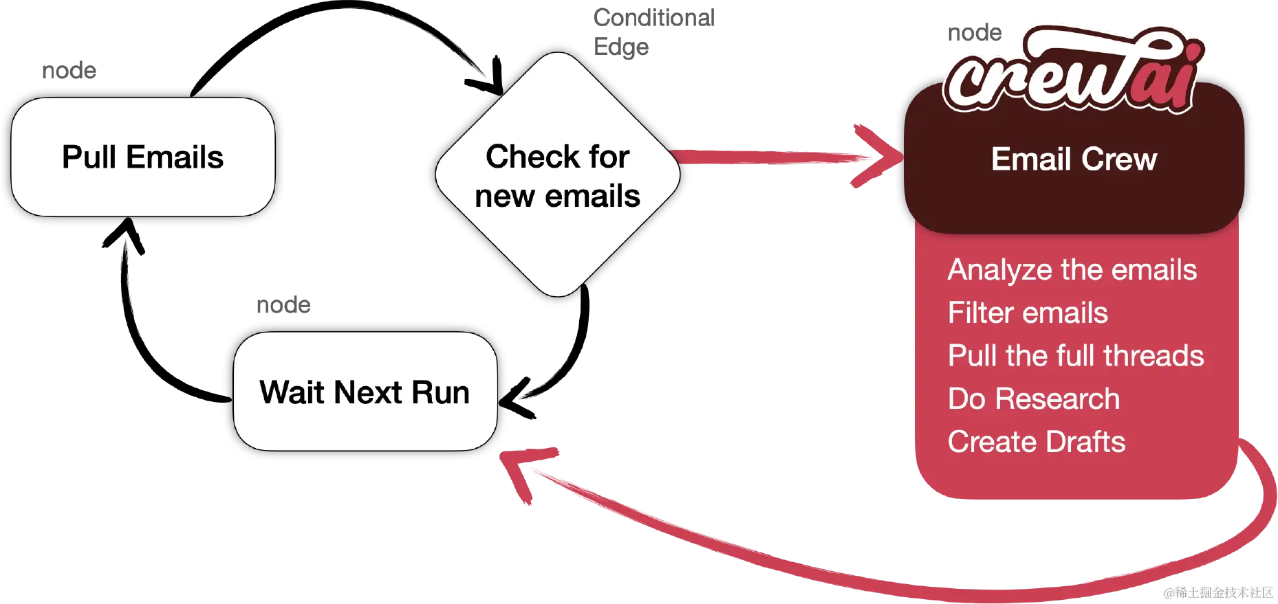 Joao Moura 搭建了一个很棒的示例,展示了如何使用 CrewAI 与 LangChain 和 LangGraph 自动处理电子邮件并创建草稿。 CrewAI 协调自治 AI 代理,使他们能够高效协作和执行复杂任务。