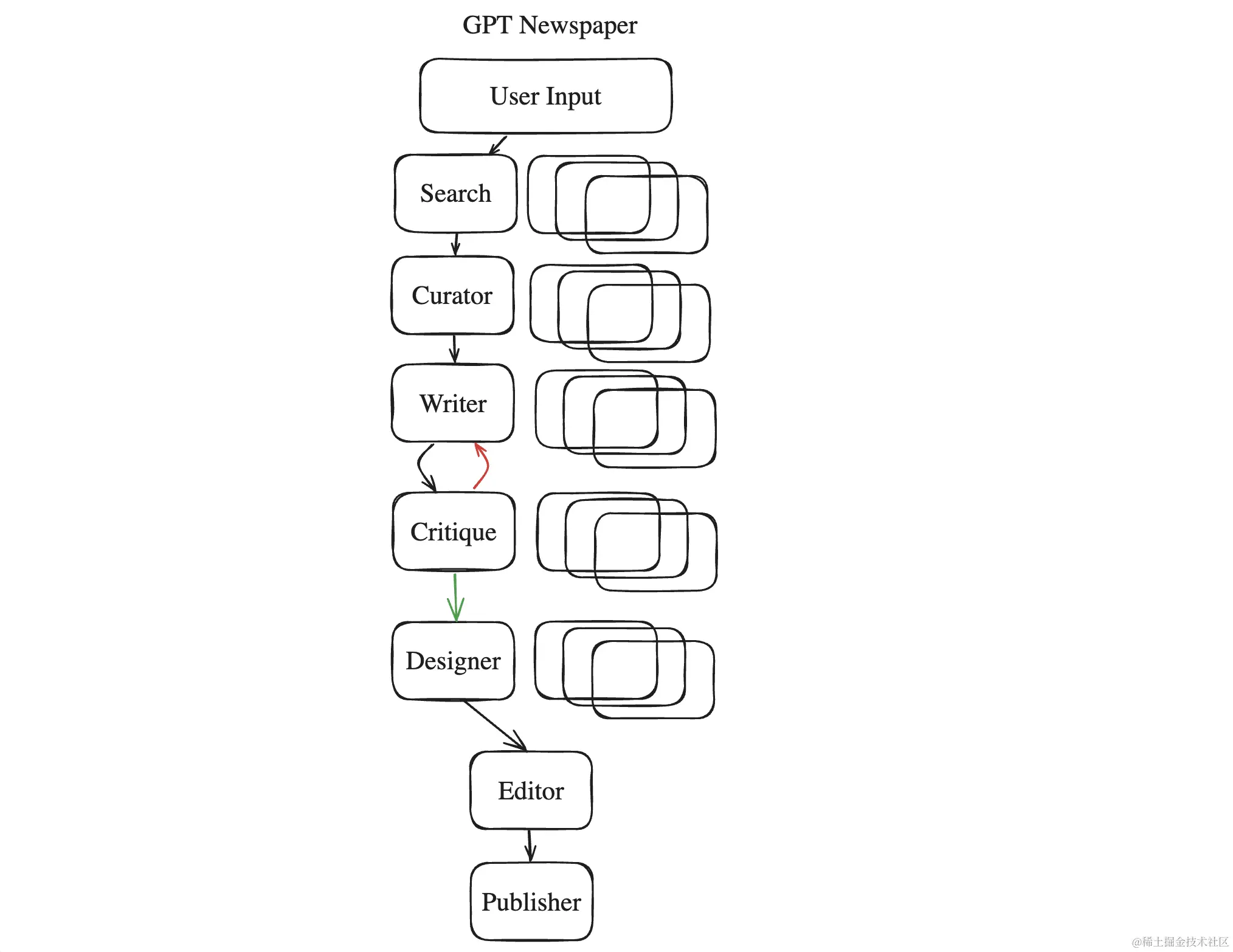 这是GPT-Researcher构思的一个新项目。 GPT-Newspaper是一个创新的自治代理,旨在创建根据用户偏好定制个性化报纸。 GPT Newspaper通过利用AI的力量根据个人口味和兴趣策划、撰写、设计和编辑内容,从而革新了我们消费新闻的方式。 该体系结构由六个专门的子代理组成。 有一个关键步骤-作家<>评价循环,这增加了一个有用的循环。