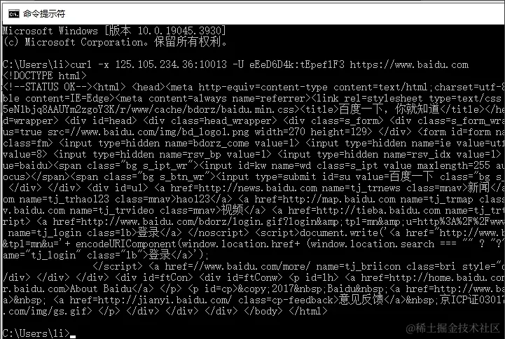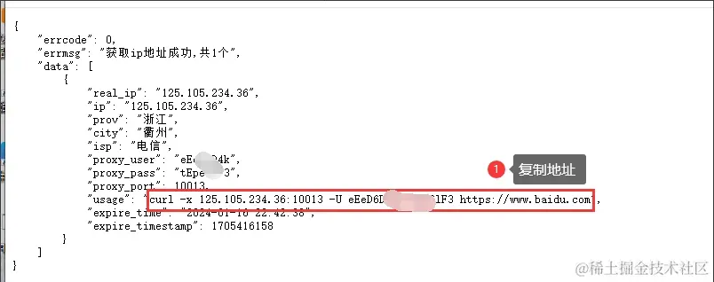 复制信息curl -x 125.105.234.36:10013 -U eEeD6D4k:tEpeflF3 www.baidu.com