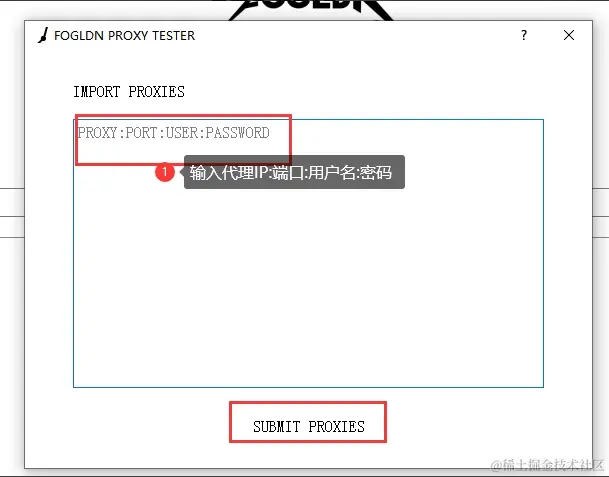 在弹窗输入代理IP:端口:代理用户名:密码,然后点击SUBMIT PROXIES