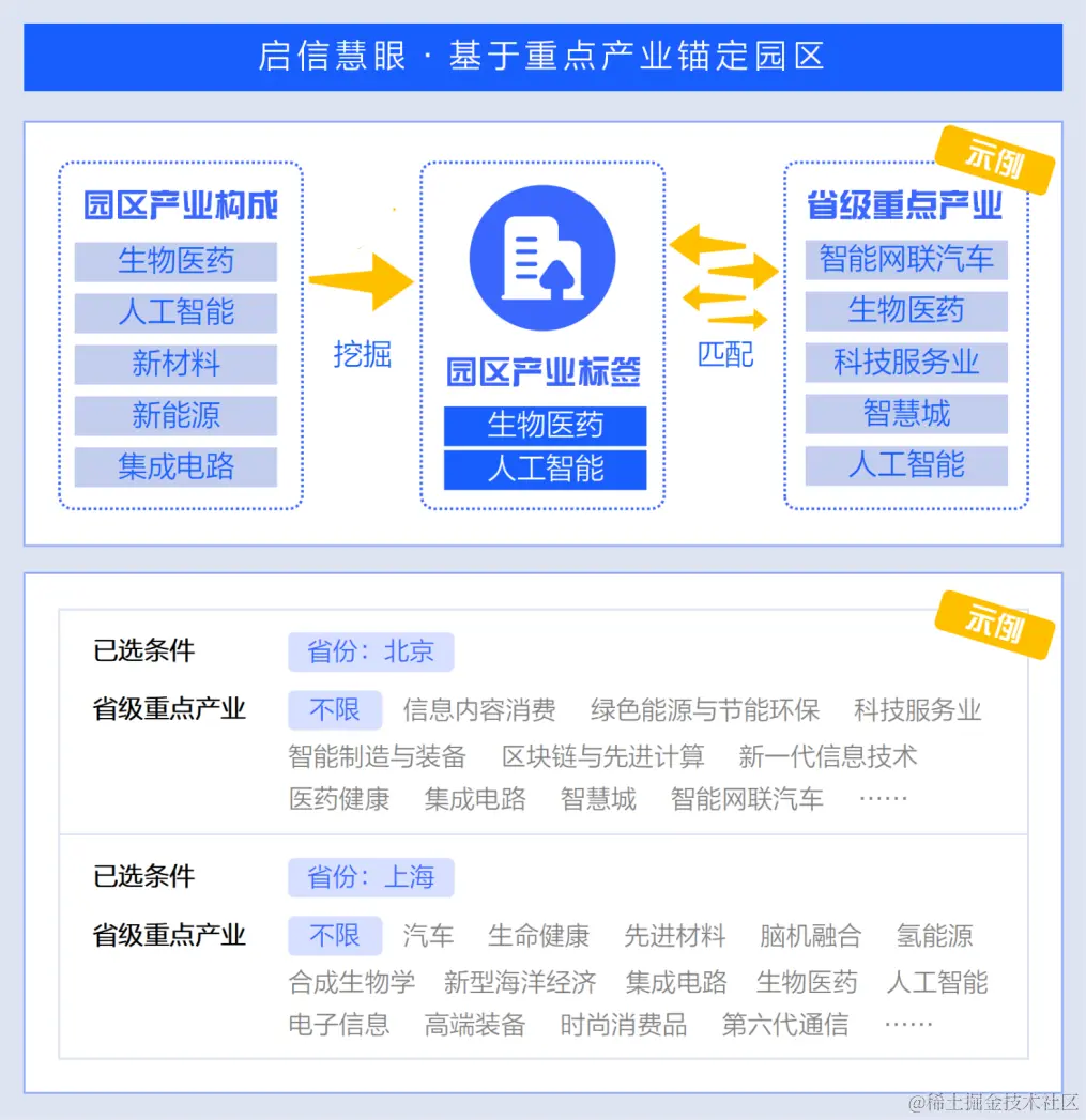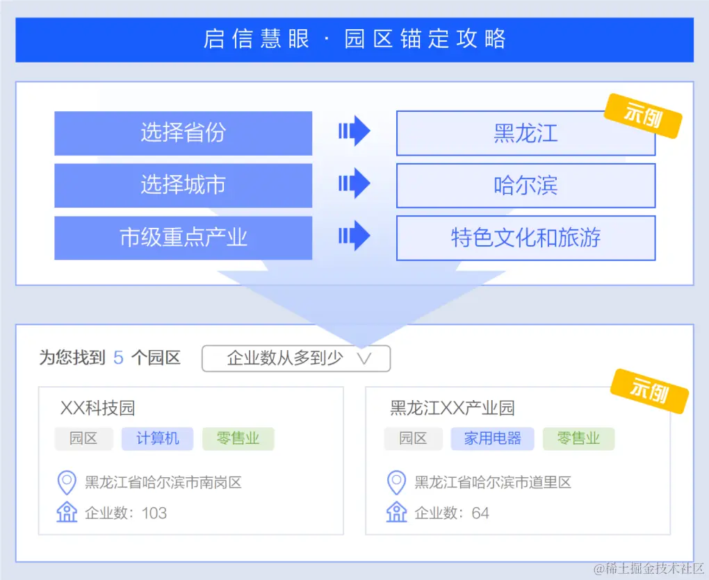 现阶段,启信数据基于境内2.3亿家企业等组织机构的超过1000亿条实时动态商业大数据,现已形成包含超过300条产业链、7万个标准产品、4000万家公司的数据库,赋能园区金融解决方案为银行信贷提供个性化的技术及数据支持。通过相关产品,银行可全景式查看园区信息,降低企业调研及分析门槛,确定重点企业(龙头企业),划分信贷服务优先级,实现批量化获客,更高效地完成特色产业布局,发挥金融“输血”作用。