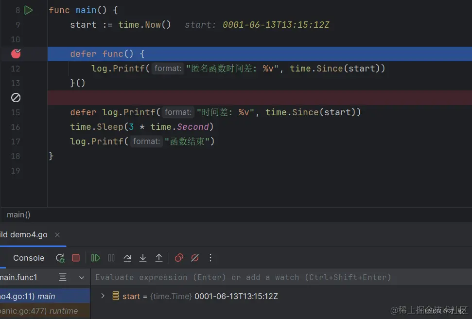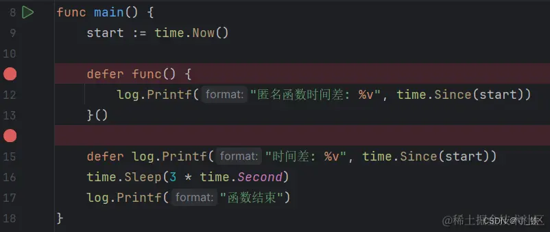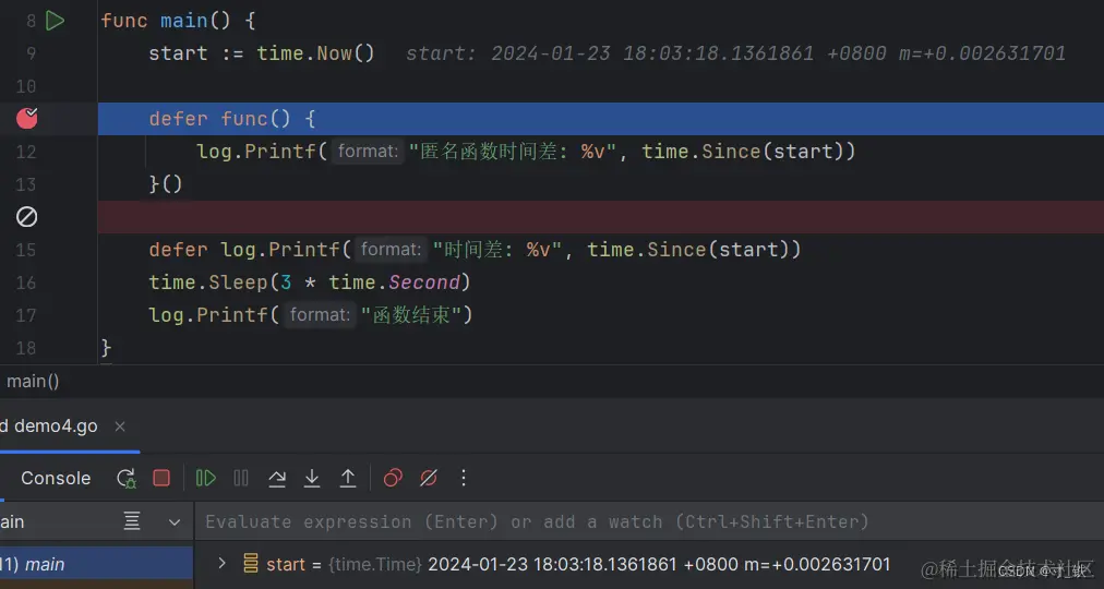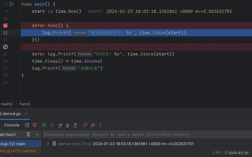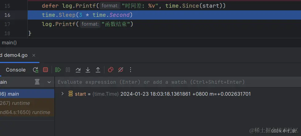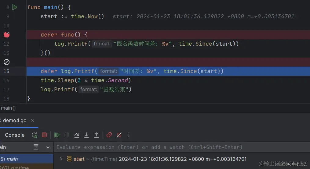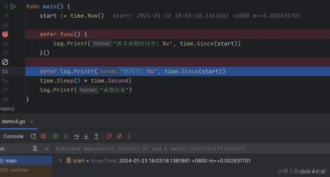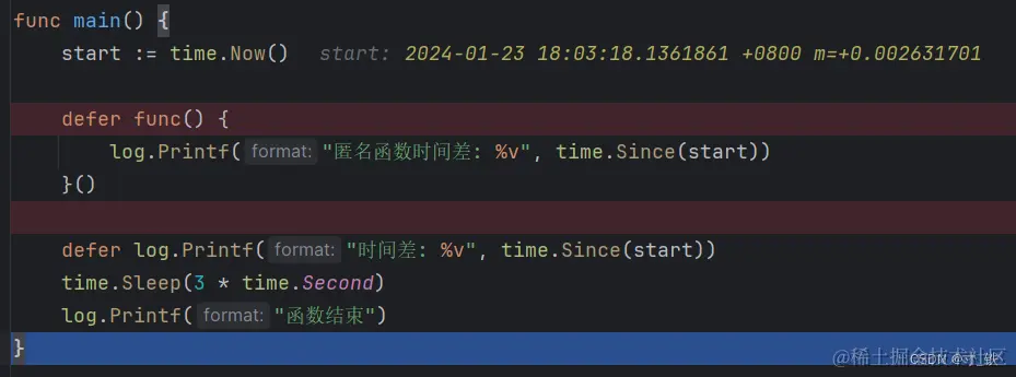 关键点:defer 使用匿名函数 , 传递的是函数的指针(函数是一种指针类型),结合刚才的断点分析,不会在一开始调用defer + 匿名函数的时候就直接赋值,而是在后面main函数退出时,再执行defer +匿名函数 时再传入函数的指针,并给start变量赋值。