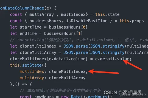 <Picker mode='multiSelector' onChange={this.onDateChange} onColumnChange={this.onDateColumnChange} range={multiArray} value={multiIndex}>