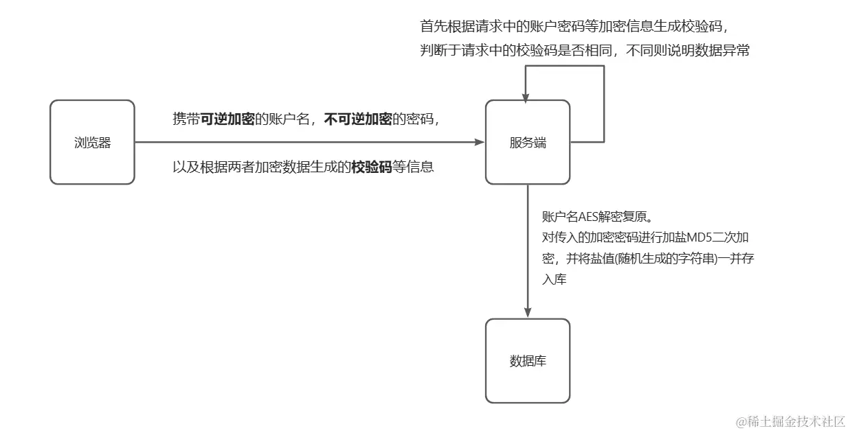 1.前端对账户信息进行AES加密(与后端使用同一密钥),密码进行MD5加密,再将加密后面的两个字符串拼接在一起,进行MD5加密作为我们的校验码(校验加密数据在请求过程中是否被更改)
