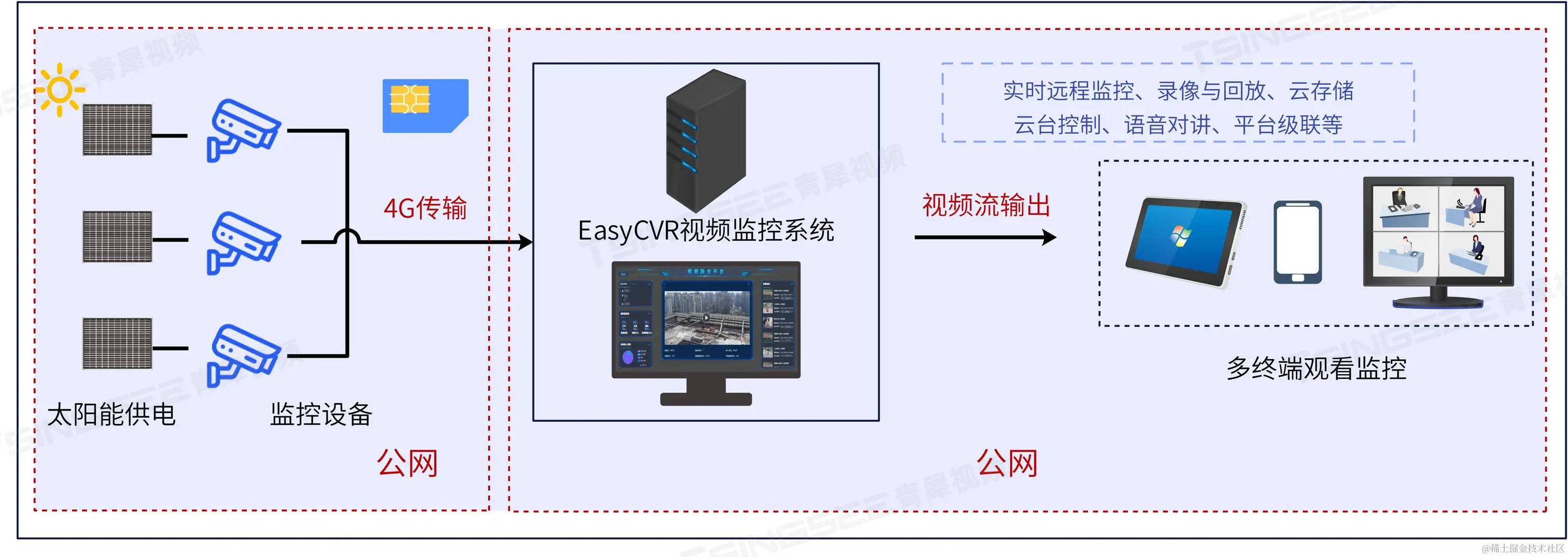 值得一提的是,EasyCVR平台还能提供基于太阳能供电+4G摄像头的远程视频监管方案,基于太阳能发电+蓄电池,为前端监控设备供电,切实解决场景“取电困难”难题,利用4G/5G流量卡解决网络需求,可顺利将前端摄像头的视频流便捷传输至EasyCVR视频融合共享智能监控平台。感兴趣的用户可以翻阅我们往期的文章进行了解。