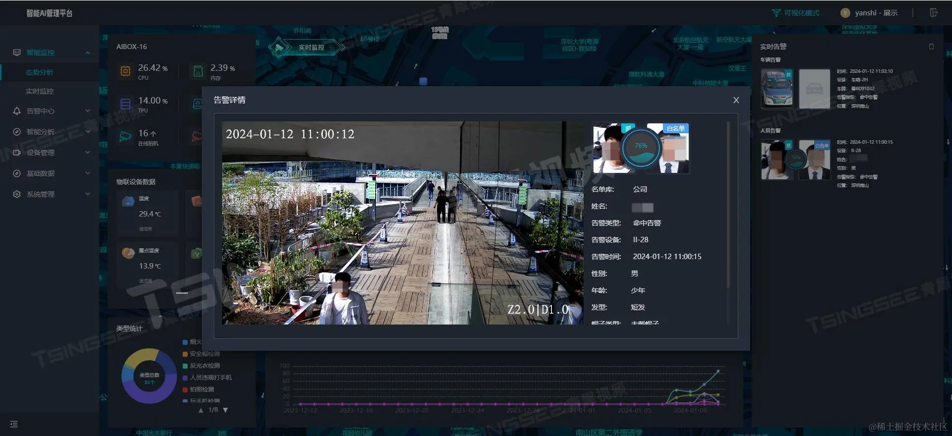 基于辖区各关键区域的监控摄像头,将监控视频流接入带有AI深度学习算法的TSINGSEE青犀智能分析网关V4,可以实现AI视频分析识别与安全隐患报警,能够实现对辖区周界、展览馆、主干道、生活区、服务区、物流区、停车场等进行关键区域入侵告警、越界检测、周界闯入检测、车辆违停、烟火检测、客流统计、行人结构化、车辆结构化分析等,通过对人脸、人体、车辆、行为与事件等进行实时识别,及时发现异常情况并处理,提高辖区的安全性和智能监管能力。