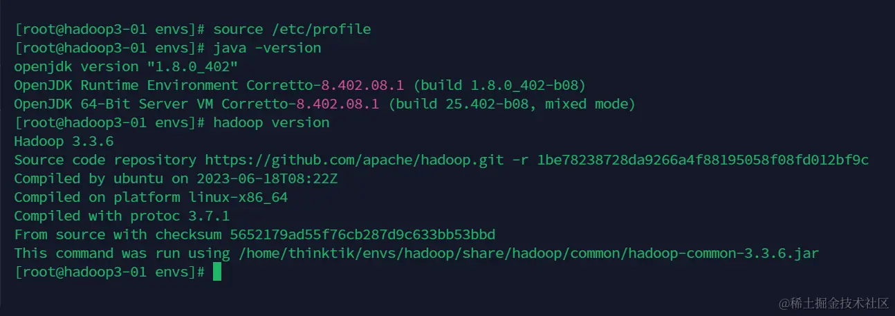 然后生效环境变量source /etc/profile,检查下java和hadoop是否配置好了