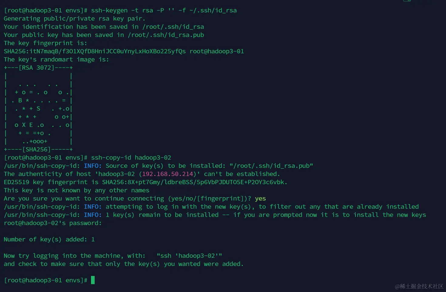 # 以hadoop3-01向hadoop3-02发送密钥为例(每个主机都需要向其他4个主机发送密钥)
