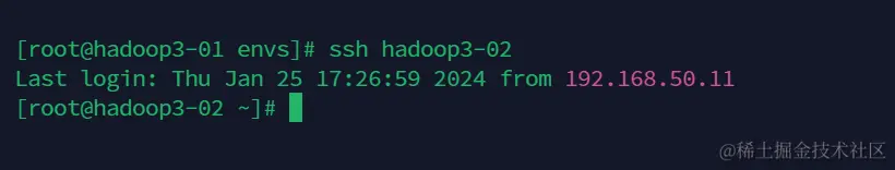 操作完成后,我们可以在linux上互相ssh下,会发现不需要密码就可以互相ssh通