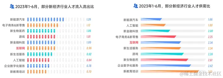 同时,互联网行业出现明显的⼈才溢出现象,很多互联网人选择“提桶跑路”,转向新兴行业。而当前比较热门行业新能源汽车、新生物医药等行业则呈现⼈才净流⼊状态,新能源行业成了当前这个时代冉冉升起的新星。