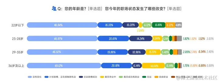 但今年互联网人的心态明显平稳了许多,有40%以上的职场人表示今年的状态没有变化,没有接触新工作机会的想法,毕竟在当前行情遇冷的互联网行业中,能够苟住就很不错了。