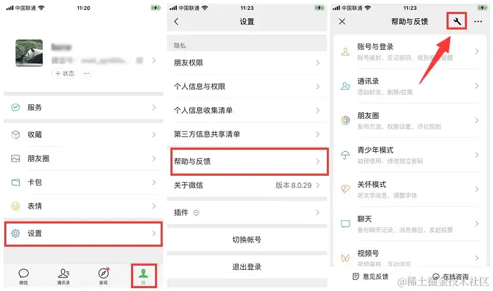 步骤1:在手机端登录微信,依次单击**【我】-【设置】-【帮助和反馈】**选项。