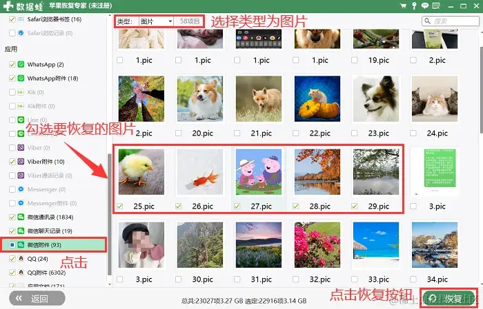 步骤3:在扫描界面左侧选择**【微信附件】。如果想要更加快速地找到我们要恢复的微信失效图片,可以在【类型】这里筛选【图片】。找到要恢复的图片,进行勾选后,点击【恢复】**按钮。