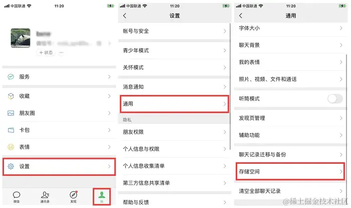步骤1:在手机上打开微信,然后依次点击**【我】-【设置】-【通用】-【存储空间】**选项。