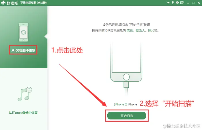 步骤2:通过USB数据线把苹果手机与电脑连接起来。没有备份的照片怎么恢复?如果你之前没有在iTunes备份过手机数据,那么可以直接选择**【从iOS设备中恢复】模式,接着点击【开始扫描】**按钮。