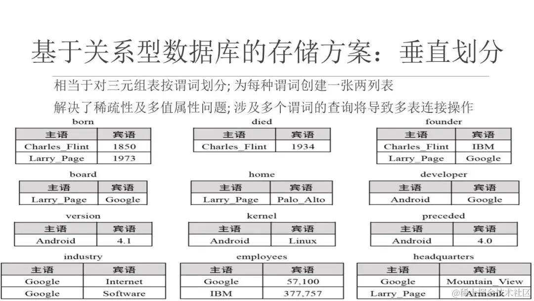 垂直划分 (vertical partitioning) 存储方案,为每种谓语建立一张两列的表(subject,object), 表中存放知识图谱中由该谓语连接的主语和宾 语, 表的总数量即知识图谱中不同谓语的数量.