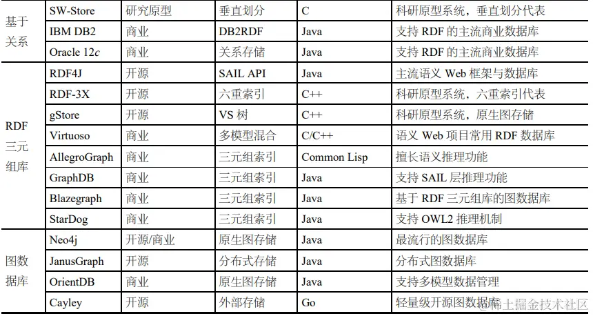 | AllegroGraph | 商业 | RDF 图 / 三元组索引 | SPARQL | 对语义推理功能具有较为完善的支持 | |