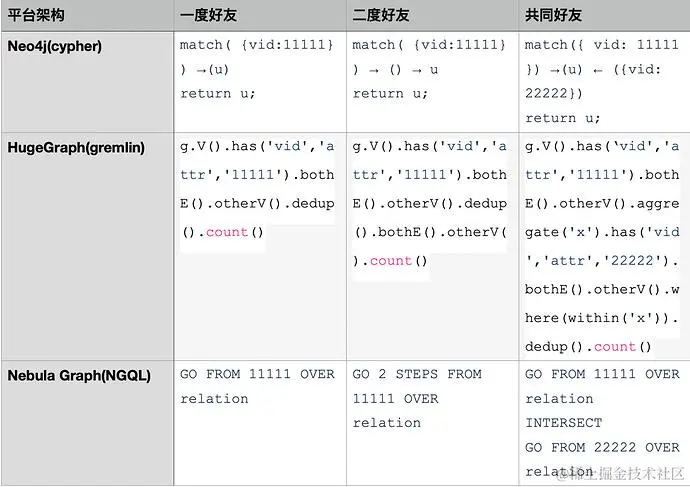 从查询语句的角度出发,Gremlin 比较复杂,nGQL 和 Cypher 比较简练,从可读性角度出发,nGQL 比较类 SQL 化,比较符合大家的使用习惯。