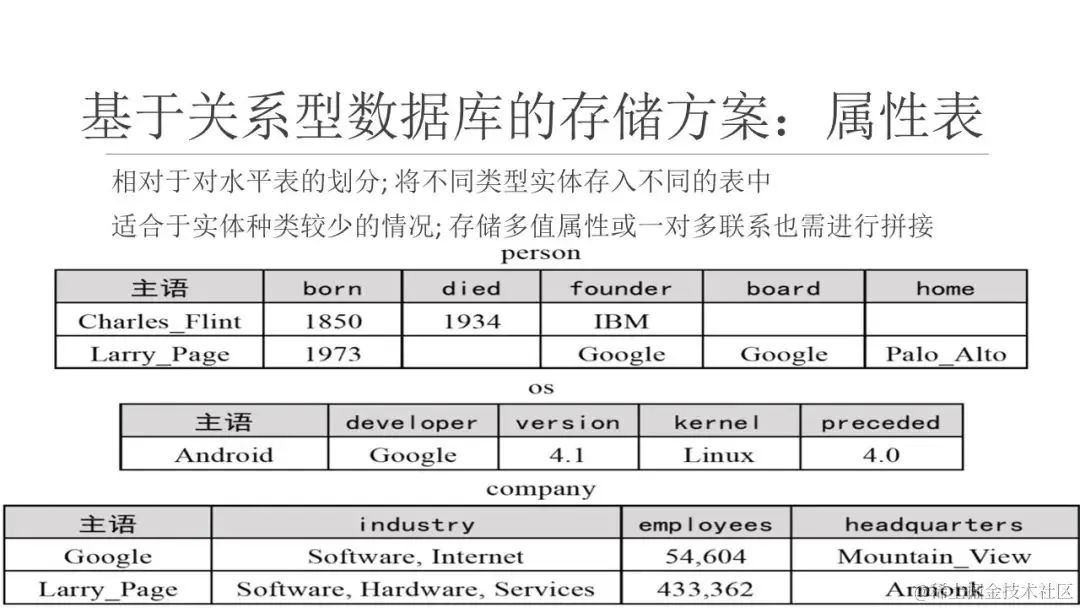 - 属性表既克服了三元组表的自连接问题,又解决了水平表中列数目过多的问题。实际上,水平表就是属性表的一种极端情况,即水平表是将所有主语划归为一类,因此属性表中的空值问题得到很大的缓解。
