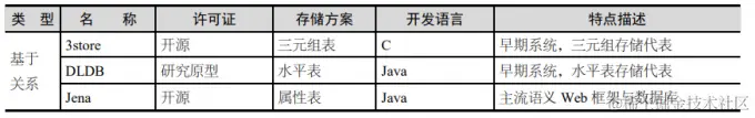 | 基于关系 | 3store | 开源 | RDF 图 / 三元组表 | SPARQL | 否 |