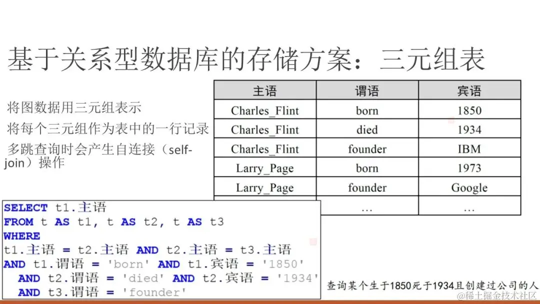 - (2) 当知识图谱查询变得复杂时, 会产生大量的连接索引表查询操作, 依然不可避免索引表的自连接.