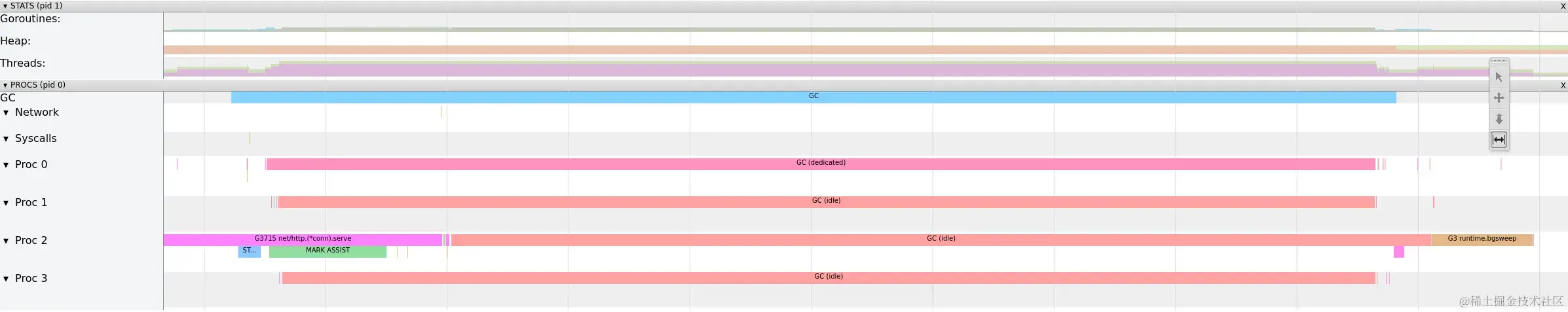 可以使用runtime/trace包收集trace,然后用go tool trace对其进行分析。下面的trace显示了在我的机器上捕获的一个GC周期,可以看到在Proc 5中STW阶段的扫描终止和标记终止。