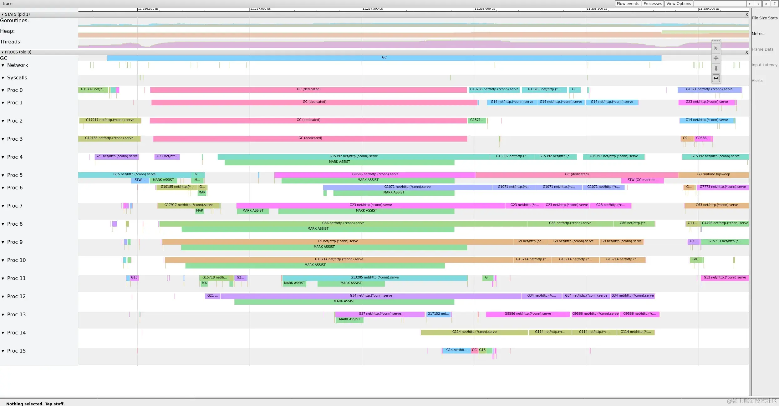 在这个trace中,尽管负载完全相同,但垃圾收集时间要短得多。GC周期小于1ms,STW时间为26μs,约为无限制时的1/10。