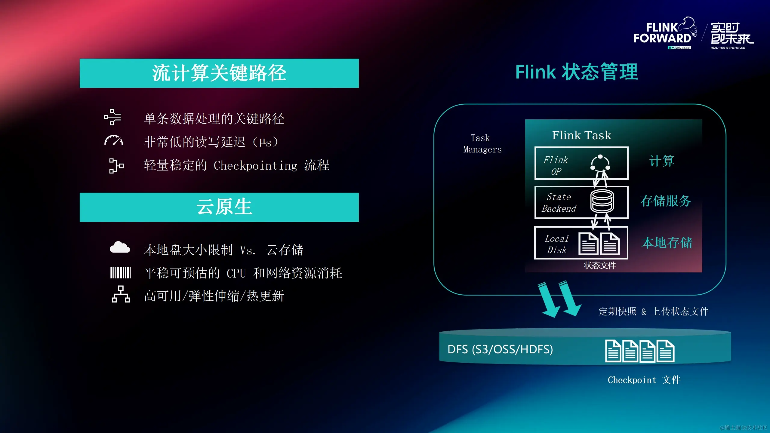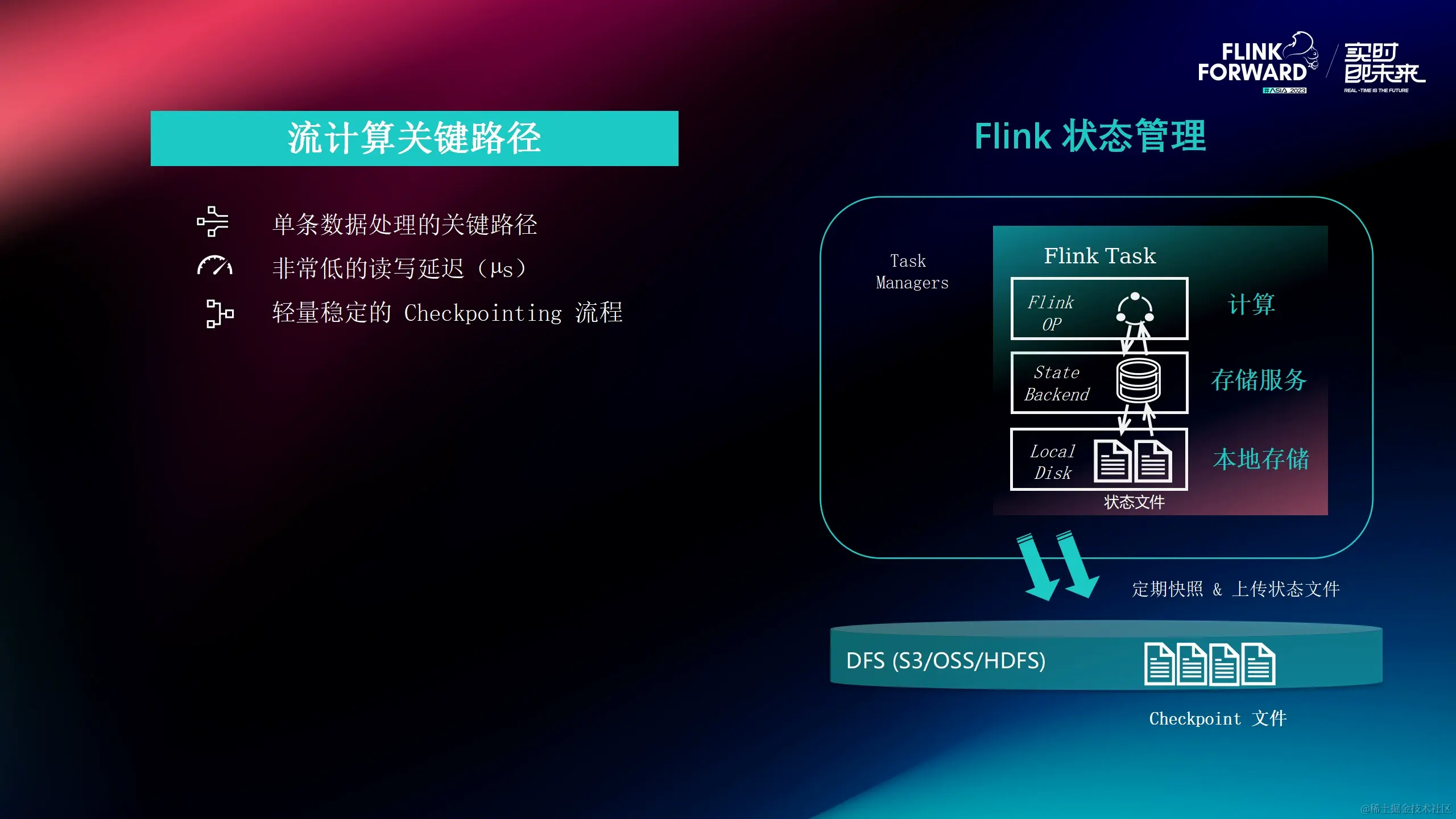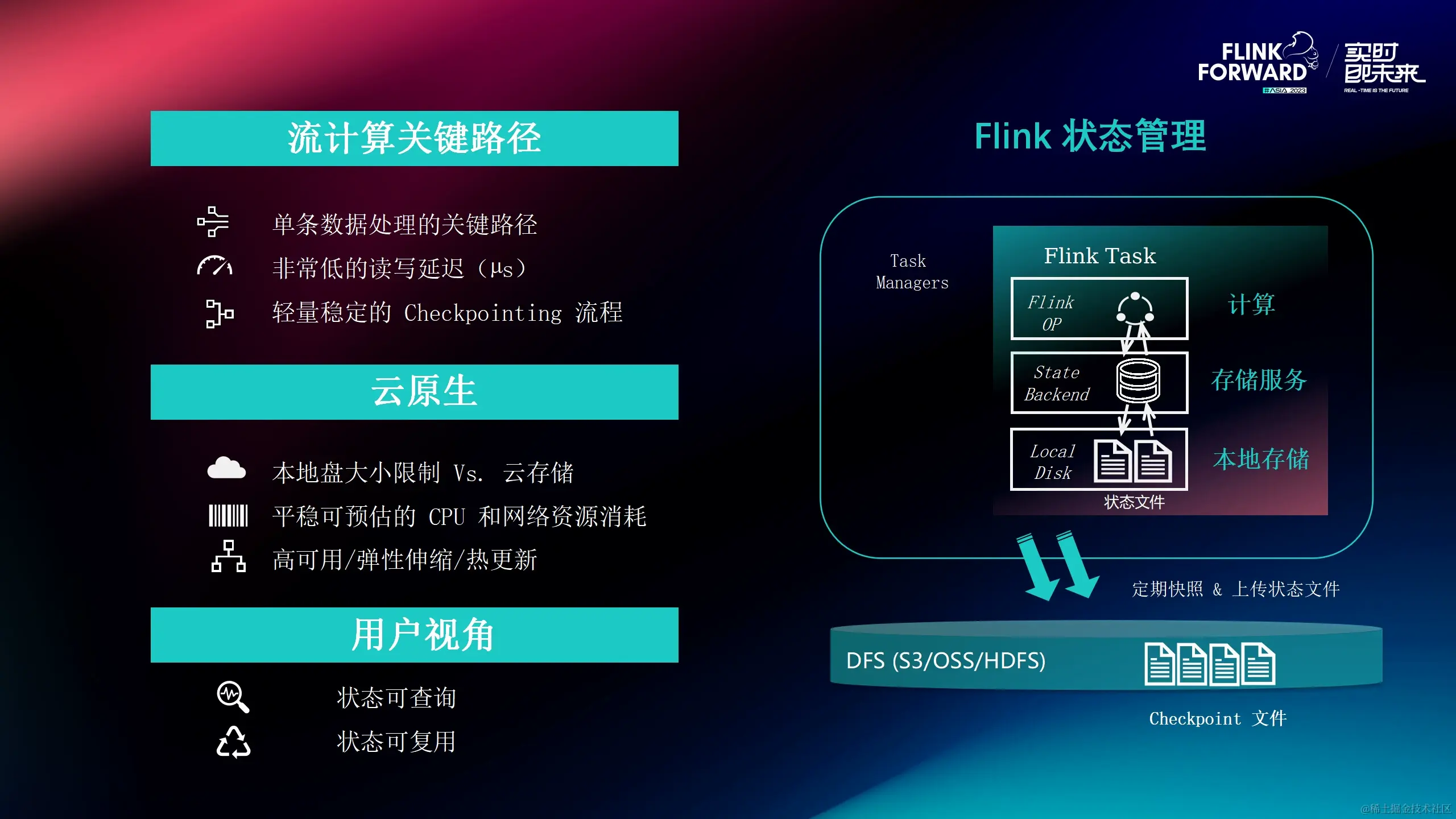 第一是状态访问在流计算中起到了非常关键的作用。在单条 record 的访问路径上,状态访问的处理速度会严重影响到 TPS ,这也是之前很多尝试 Flink 远端状态存储访问会非常慢的原因。