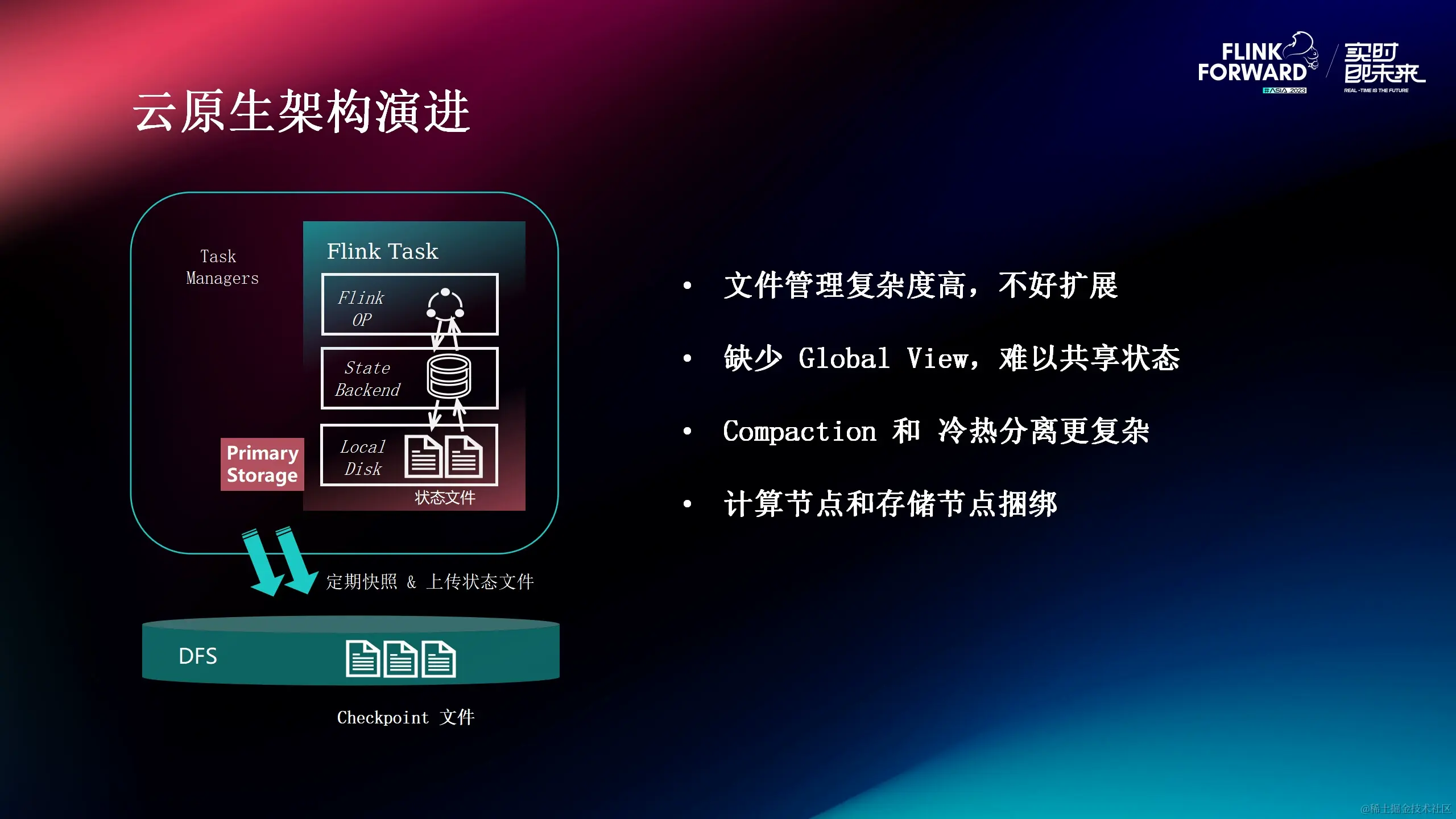 在 Gemini 的统一文件管理架构中,状态文件会在本地盘满了以后刷到 DFS,但仍然以本地存储作为 Primary Storage。这种形式的弊端是让文件管理比较复杂而且不太好扩展,比如说我们有更多层的存储时需要架构有较大改动。这种形式相对于把本地存储当成 Cache 的情况会更复杂,特别是对于文件写失败等异常情况的处理。其次,以本地 state 为主存的模型中,每个 Task 缺少算子完整状态的 Global View,这会让状态的共享化比较难以实现,对于一些状态特别大且有共享需求的作业来说,实现成本就会成倍增加。更关键的是现在这种模式下,很多 DB 设计都是基于本地存储为主存的前提做的,这让状态 DB Compaction 和冷热分离策略都变得相对复杂,计算节点和存储节点的捆绑实际还是比较紧密的。