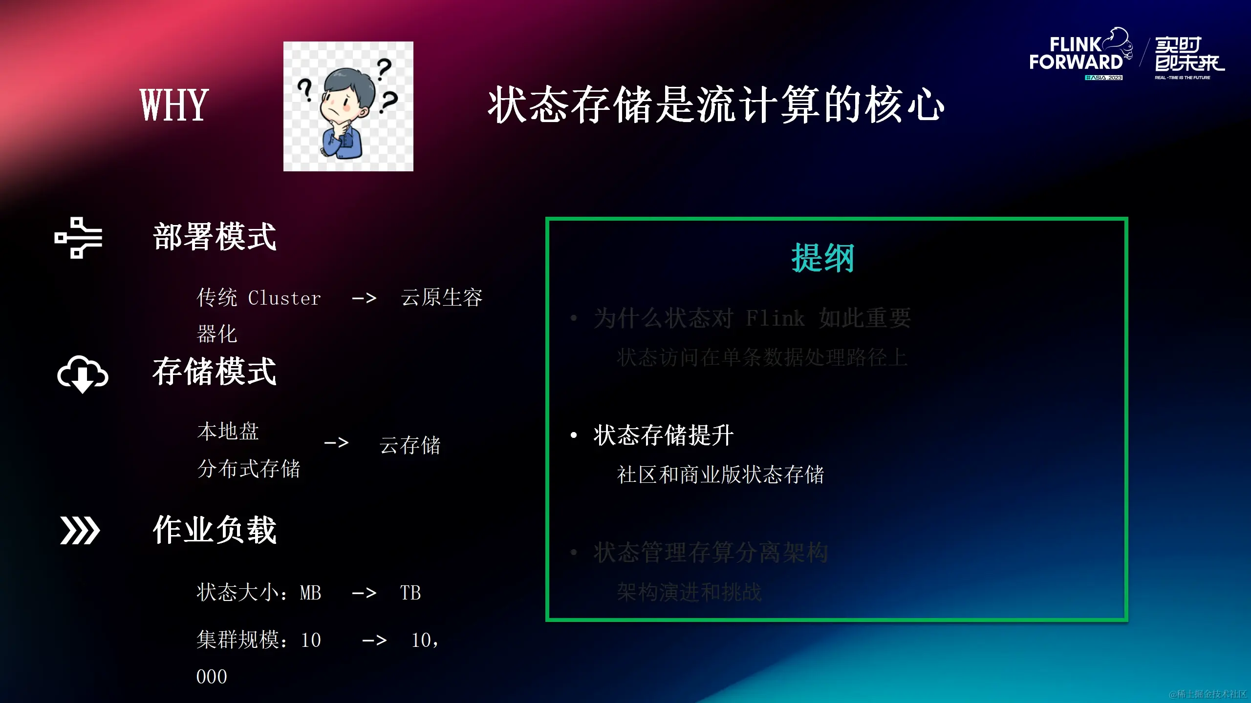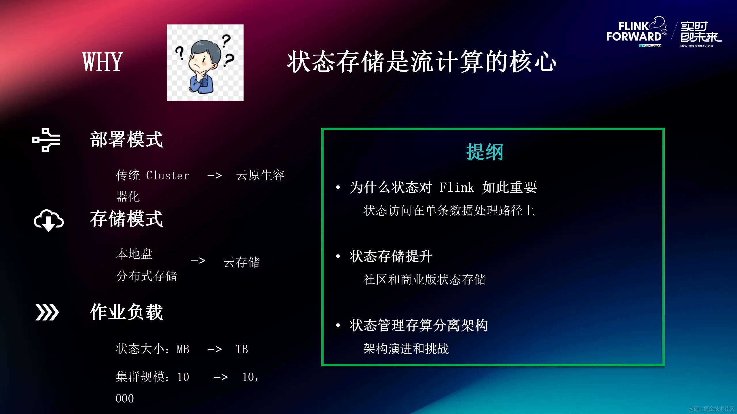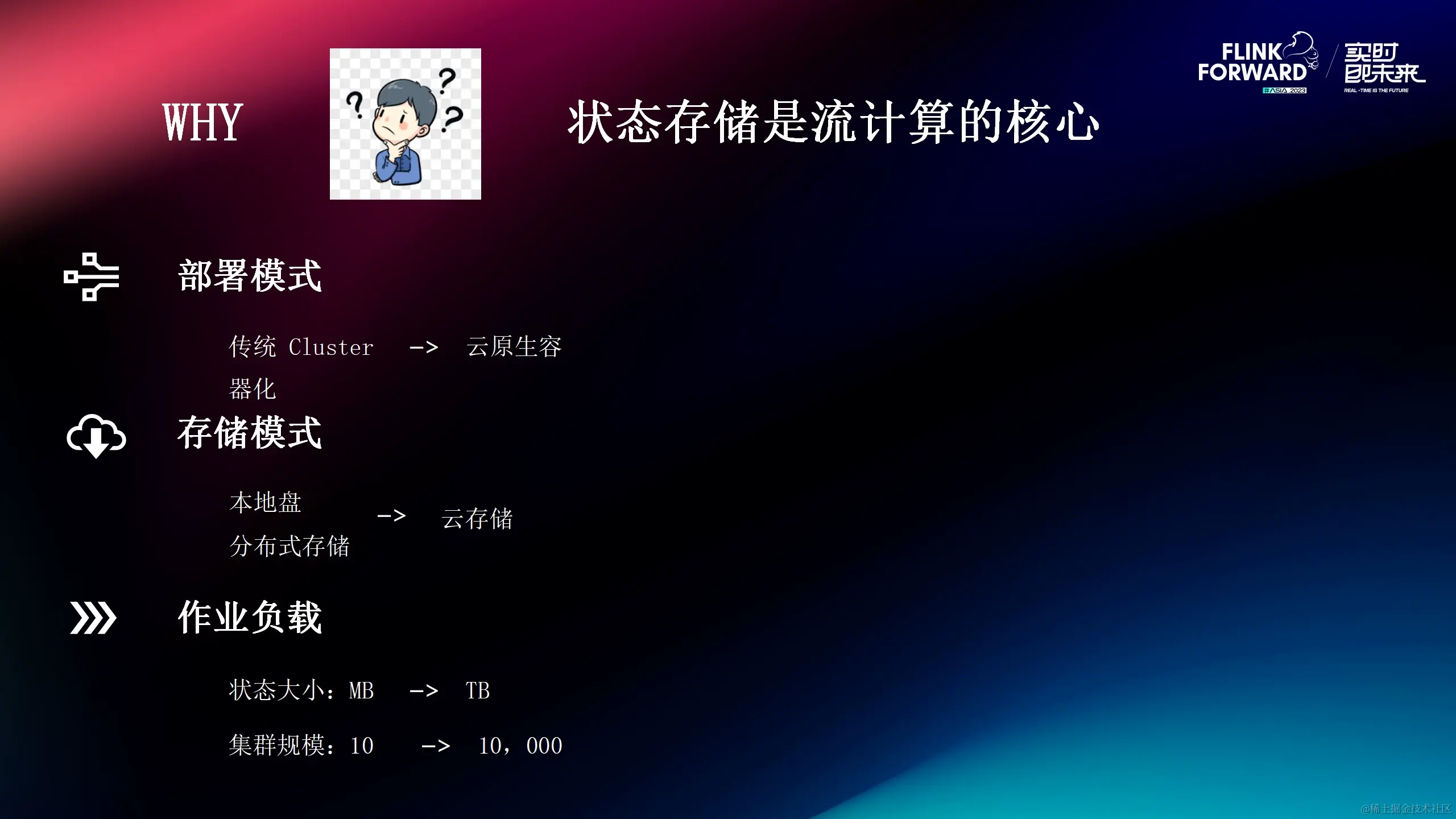 我们在这个时间点重新聊状态存储这个话题是因为状态存储是流计算的核心。Flink 从 2017 年 VLDB 发表奠基之作介绍状态存储发展至今,Flink 在状态这部分的架构基本并没有太大的变化。但时代是在不断演进和变化的,无论部署模式、存储模式,还是作业负载,都已经发生了翻天覆地的变化。