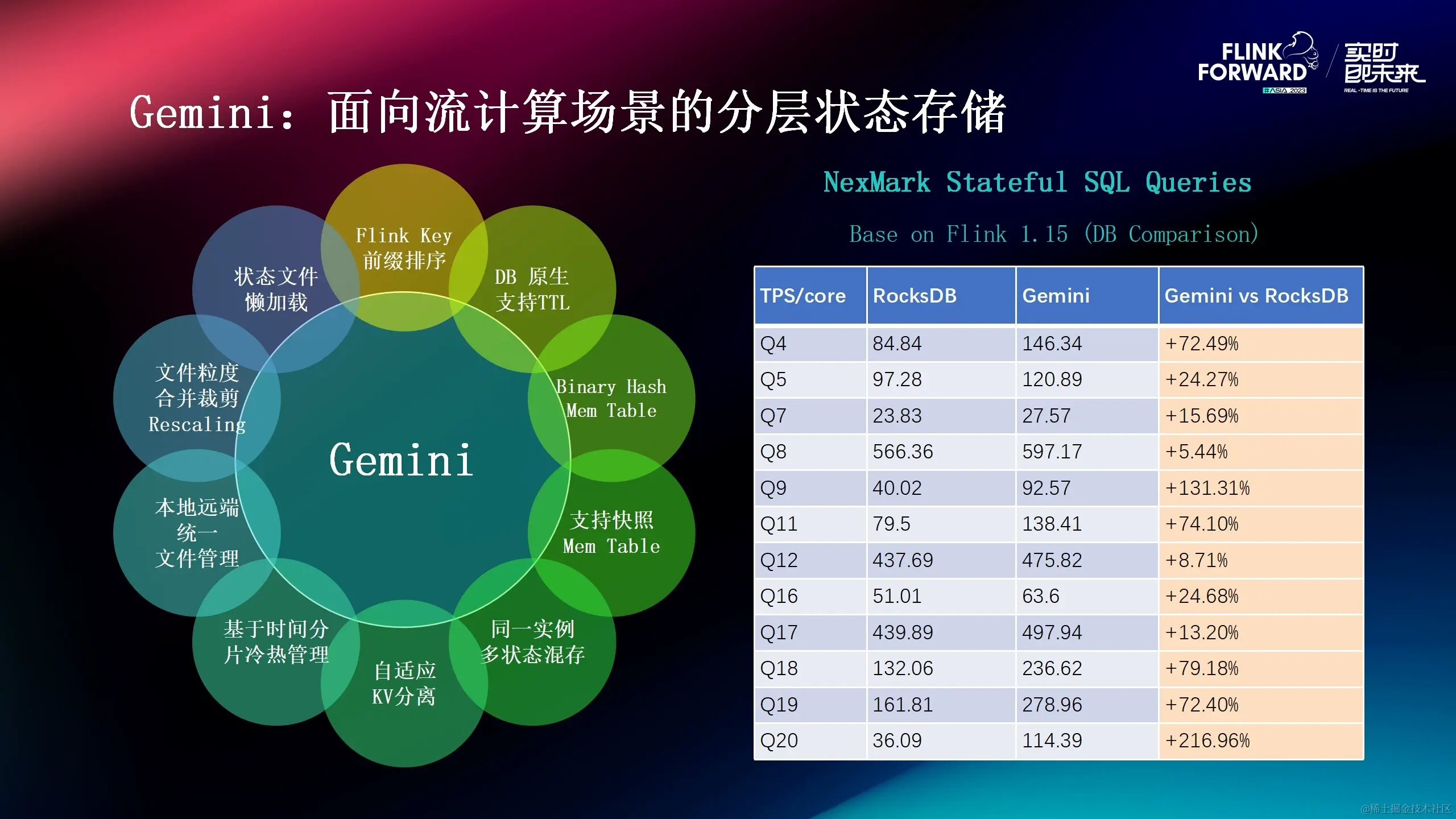 Gemini 在阿里内部全量上线,服务于不同状态大小的作业(从几百MB到上百TB),也成功度过了 2021 — 2023 双十一的洗礼,取得了非常好的降本增效效果。另外,我们基于 Flink1.15 利用 Nexmark Benchmark,对 Gemini 和 Rocksdb 做了纯状态后端层面的性能对比,从测试结果可以看出 Gemini 对作业性能(单核吞吐能力)提升效果十分显著,平均 50%+。