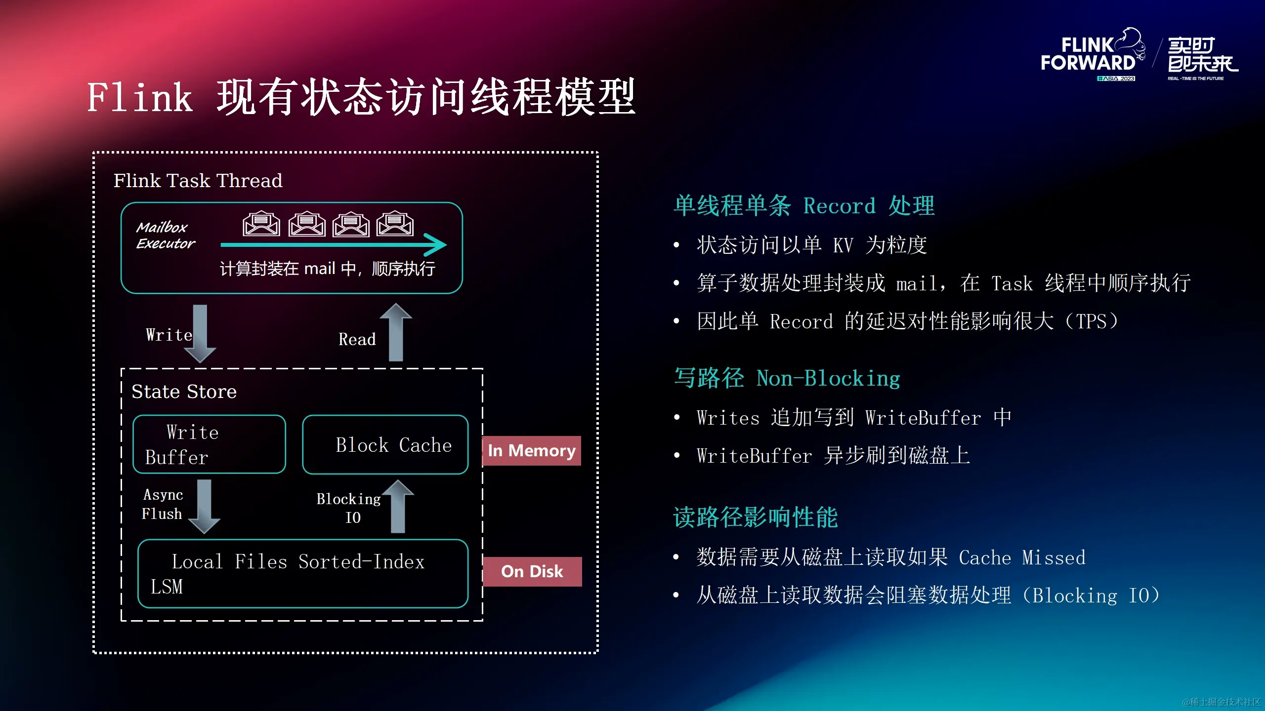 性能回退的原因是受限于目前的 Flink 线程访问模型,数据处理必须以单线程单条 Record 处理的模式进行,对 State 访问的延迟极其敏感。其中,状态访问以单 KV 为粒度;算子数据处理会封装成 Mail,在 task 线程中顺序执行,因此单 record 的延迟对性能影响很明显。从读写链路上具体分析的话,对状态的写路径是 non-blocking 的,writes 追加写到 writeBuffer 中,writeBuffer 写满后异步刷到磁盘上,所以 write 流程对于整体的 TPS 影响不大。但是读路径是非常影响整体性能的,读数据时如果在 Block Cache 中 Cache miss,需要从磁盘上读取数据,读取过程会阻塞数据处理,影响作业总体的性能。