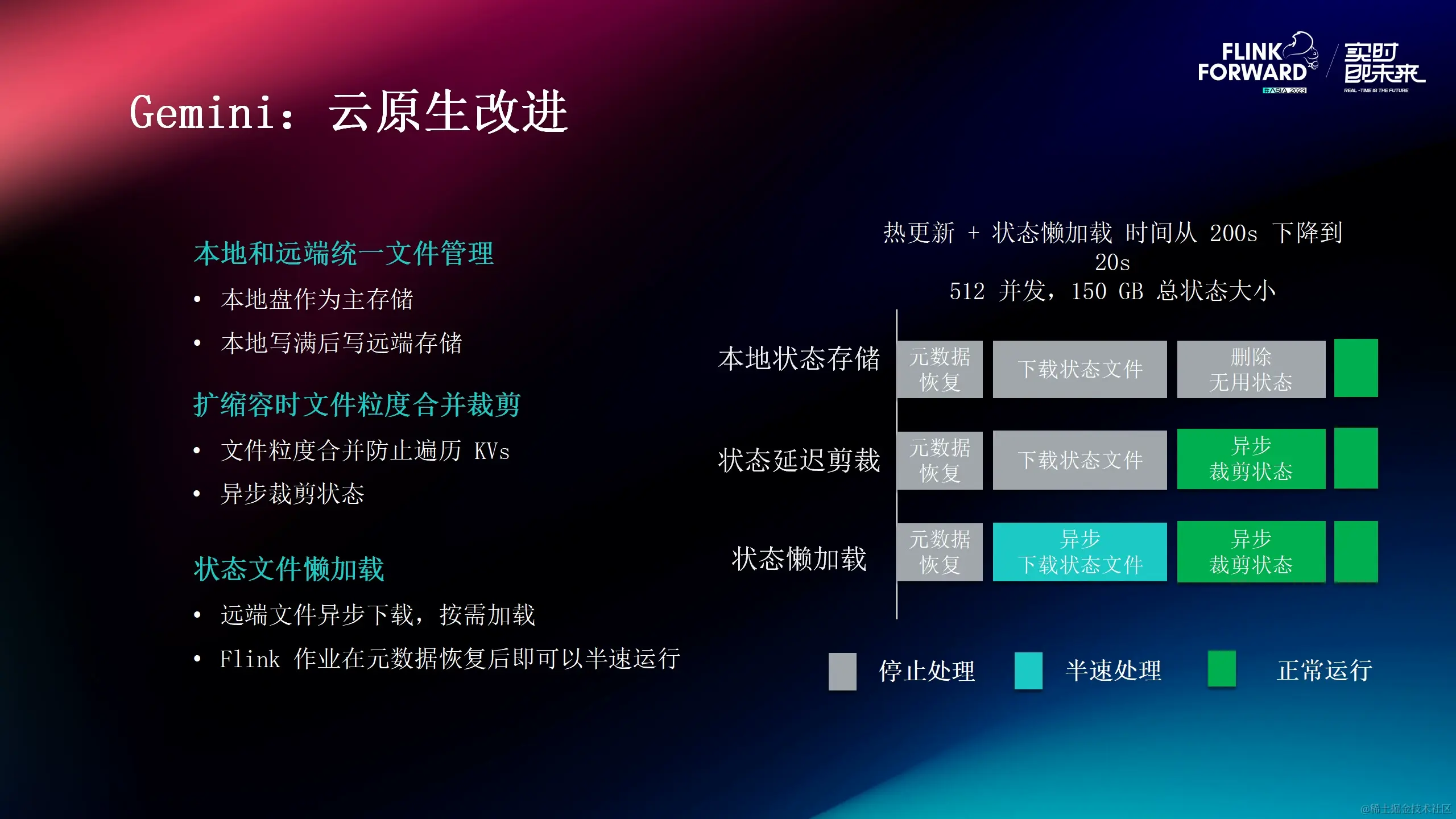 在快速扩缩容方面,Gemini 主要有两方面优化:文件粒度合并剪裁以及状态文件懒加载。其中,文件粒度合并剪裁和社区现在的做法稍有不同,Gemini 的文件裁剪是异步的,可以让作业更快地恢复;状态文件懒加载是指远端文件异步下载,按需加载,Flink 作业在恢复元数据后, 就可以开始半速运行。从我们的测试结果中可以看到,热更新+状态懒加载可以让作业停止处理的时间从 200s 下降到 20s。