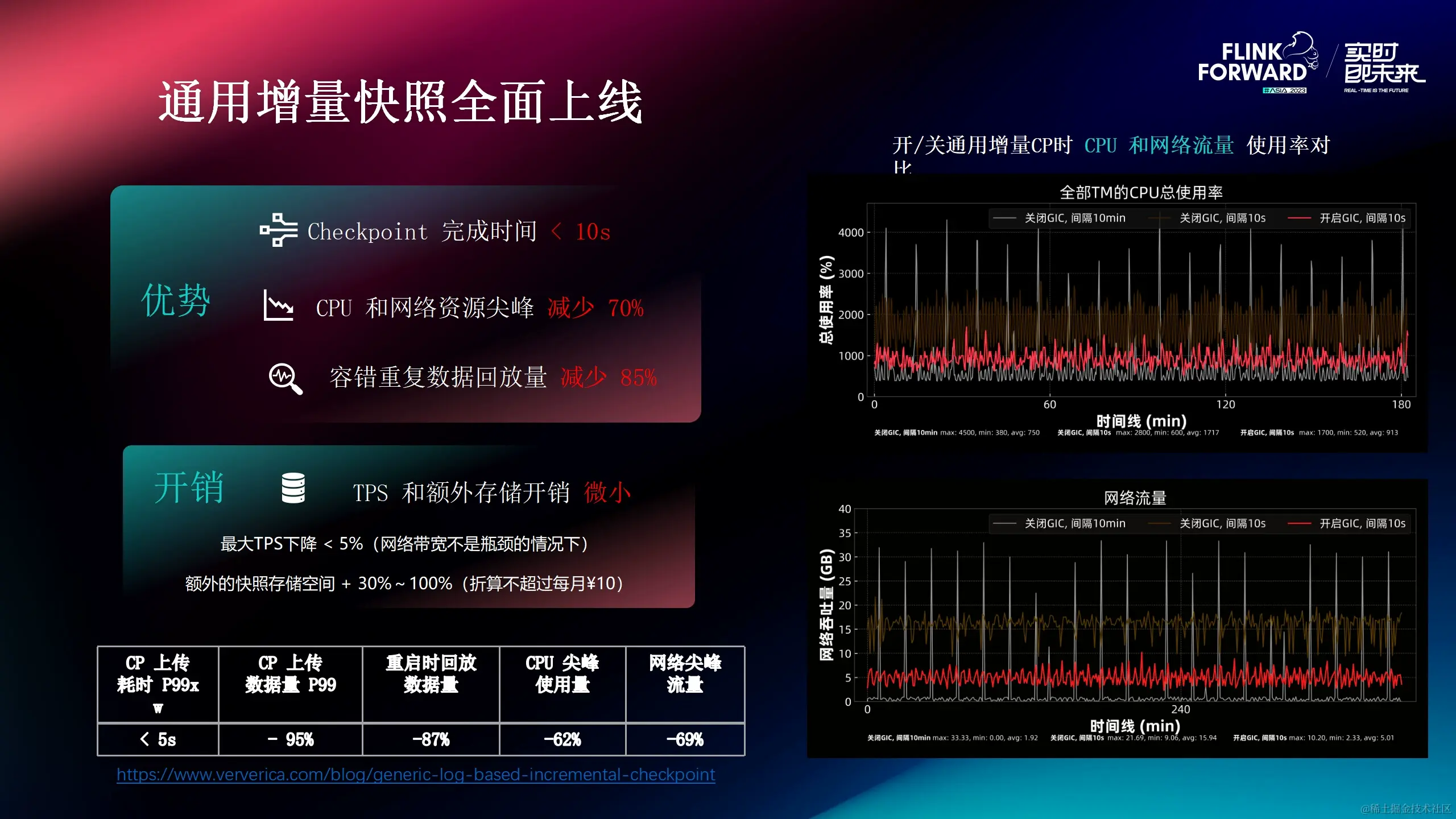 第三,社区已经推出的 Unaligned checkpoint 和通用增量 checkpoint 这两个功能 ,逐步在各大公司和厂商里广泛的实践和使用,我们内部也进行了小范围的尝试,效果很不错。