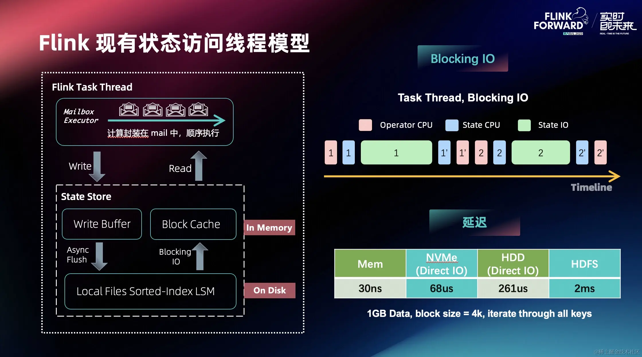 - 第一部分,先讲为什么状态对 Flink 的重要性,因为状态访问在单条数据处理路径上,处理延迟对整体性能影响很大;