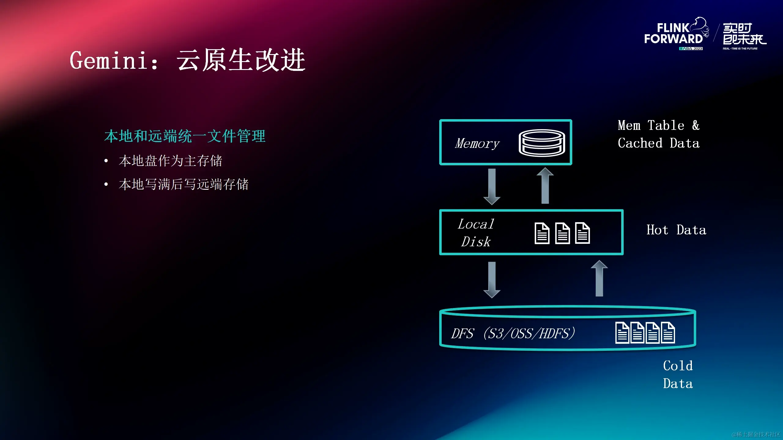 Gemini 可以看成是一个分层的状态存储,内存数据存放在 Mem Table(读写) 和 Cache(只读)中,热数据被写在 Local Disk,本地盘写满后将部分冷数据写到 DFS 上。抛开 DB 其他功能,我们重点分享一下 Gemini 存算分离方面的探索。首先,云上全托管服务都是有磁盘容量限制的,大部分用户是不愿意为状态把本地盘写满这件事情额外付费去增加并发的,所以 Gemini 实现了本地和远端统一的文件管理,把本地盘作为主存,DFS 作为再下一级存储,在 DFS 上数据量不大的情况下,性能是可以接受的,但是如果频繁访问 DFS,性能还是会有较大的影响。