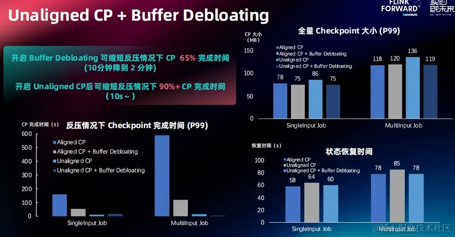 Unaligned Checkpoint 和 Buffer Debloating 主要是为了防止或者减少反压时 Checkpoint Barrier 被算子间管道中数据阻塞的情况发生。从实验结果来看 Unaligned Checkpoint 在反压的时能把快照完成时间缩短 90%(这个前提是 state size 不能太大,barrier 对齐时间是主要因素)。另外,因为 Unaligned Checkpoint 存储了算子管道中的数据,所以我们也测试了其对全量 Checkpoint 大小和状态恢复时间的影响,测试结果显示全量 Checkpoint 大小的增加和状态恢复的额外时间基本上可以忽略不计。