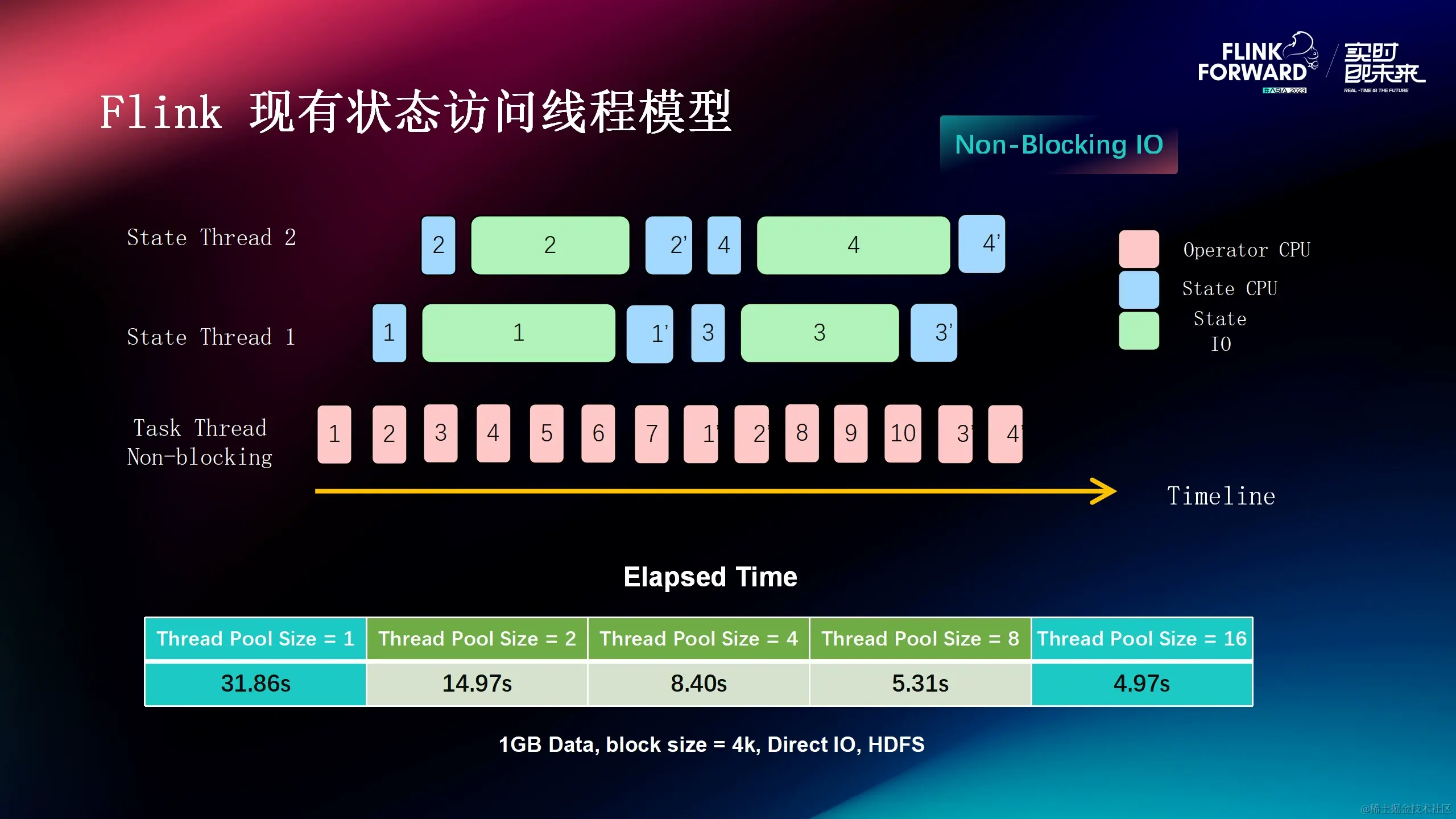 为了解决这个问题,我们可以考虑把 Task 线程的 Blocking IO 改造成 Non-Blocking IO,这样才能更高效地充分利用 CPU 和 IO 资源。在 state 文件多线程并发访问的初步实验中,当我们把 thread pool size 调到足够大的时候,性能有明显的提升(约有 6 倍)。实际上,Non-Blocking IO 架构要考虑的问题肯定要比现在的 state 多线程访问实验要复杂很多,比如说同一个 Key 的执行顺序如何保证等等,我们也做了一些 POC 并得到一些初步结论,敬请期待后续文章分享。