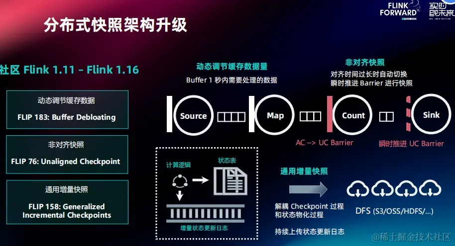 分布式快照这个部分,从 Flink 1.11 版本开始,历经社区 6 个版本,我们在 Checkpoint 的稳定性和完成速度方面做了一些工作,主要包含三个功能:动态调节缓存数据(Buffer Debloating)、非对齐快照(Unaligned Checkpoint)、通用增量 checkpoint。这三个功能在各大公司都有大规模实际落地,发挥其应有的价值。
