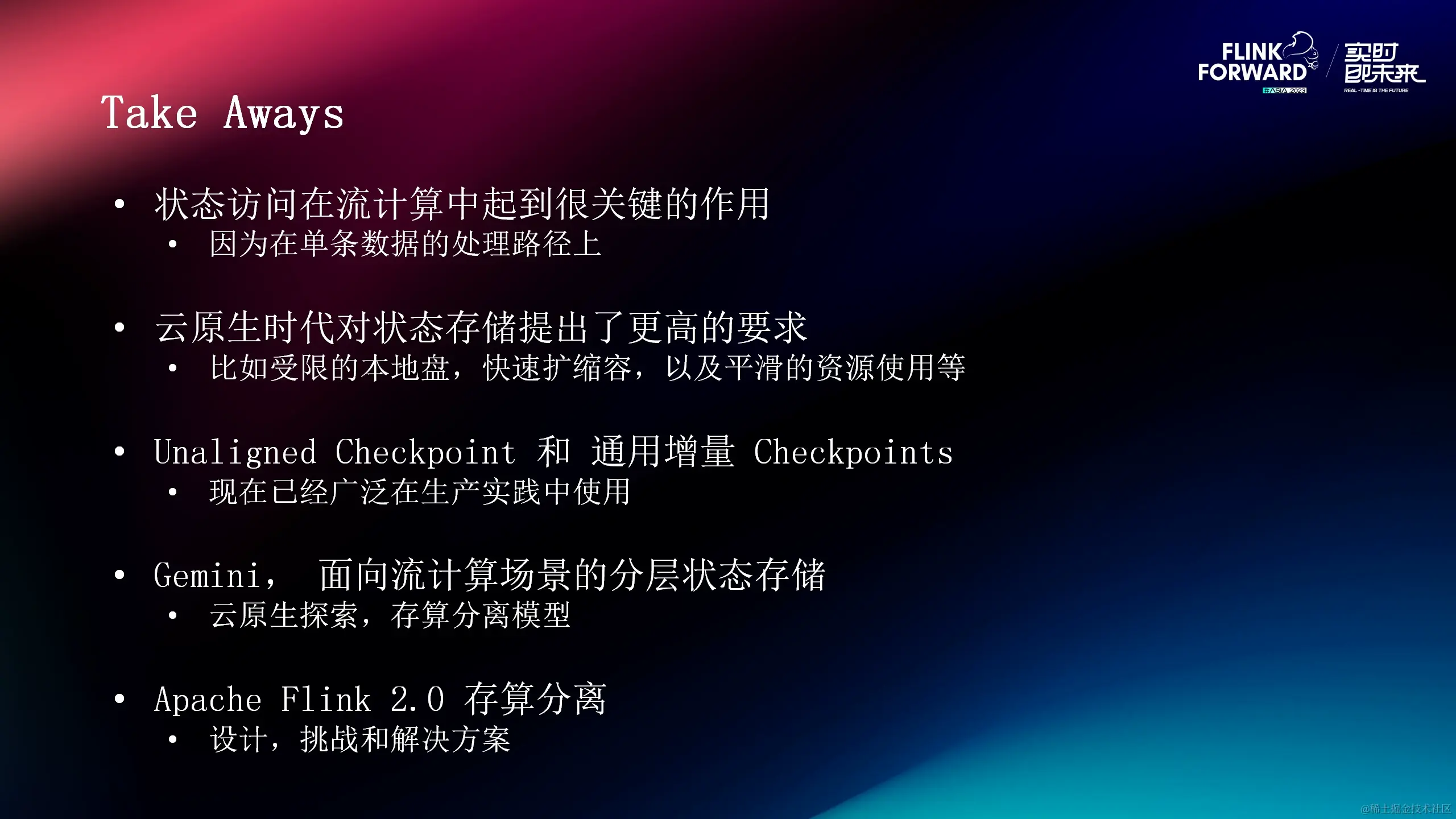 第四,介绍了 Gemini,阿里内部的面向流计算的分层状态存储,我们在这个过程中进行了一些云原生以及存算分离模型的探索。