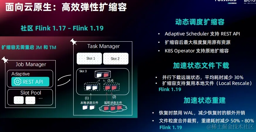 除了 Checkpoint 这个部分,社区从 1.17 开始也在尝试更高效的弹性扩缩容。