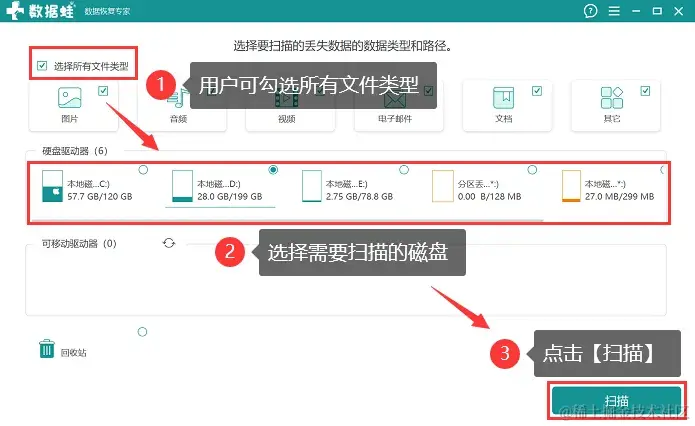步骤2:根据需要恢复的文件类型进行勾选,并勾选要进行扫描的磁盘,点击【扫描】 ;