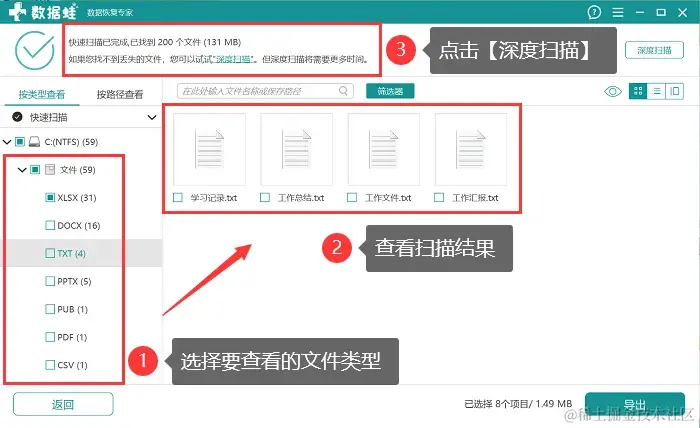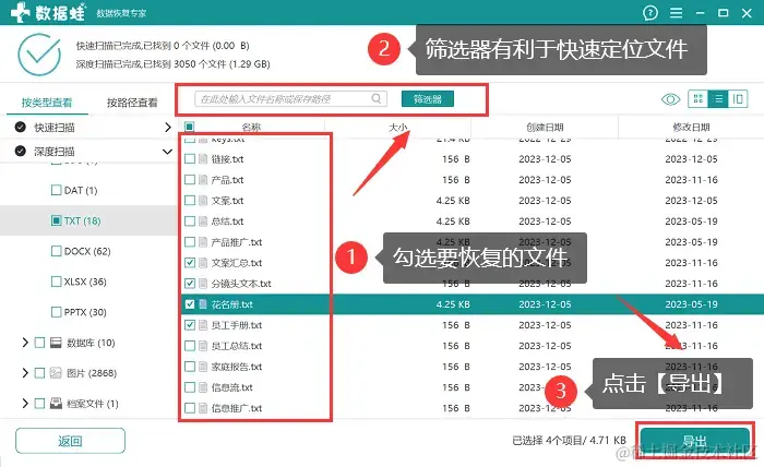 步骤4:深度扫描完成后,用户可以尝试使用 【筛选器】 对文件进行快速定位,找到需要恢复的文件后,将其【导出】。