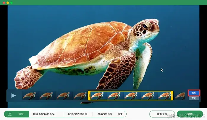 第3步:点击红色录制按钮,录屏会自动开启,录制结束后,您可以接着在当前页面对视频进行简单剪辑,然后点击保存按钮。