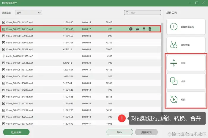 第4步:如果您还有更多的视频需求,可以来到历史记录页面,这里可以对录制的视频进行压缩、合并、转换等处理。