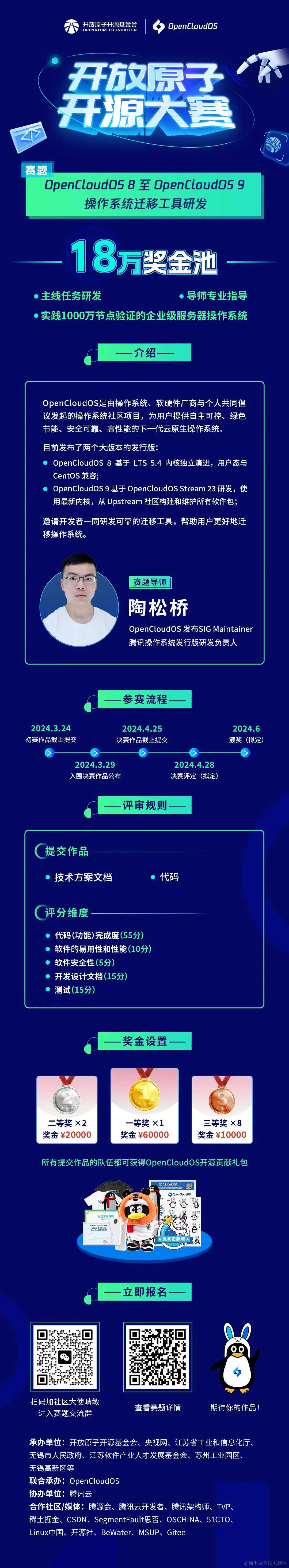 2023 年,由开放原子开源基金会承办的首届「开放原子开源大赛」面向全球开启。OpenCloudOS 社区以「OpenCloudOS 8 至 OpenCloudOS 9 操作系统迁移工具研发」为赛题参与基础软件赛道。